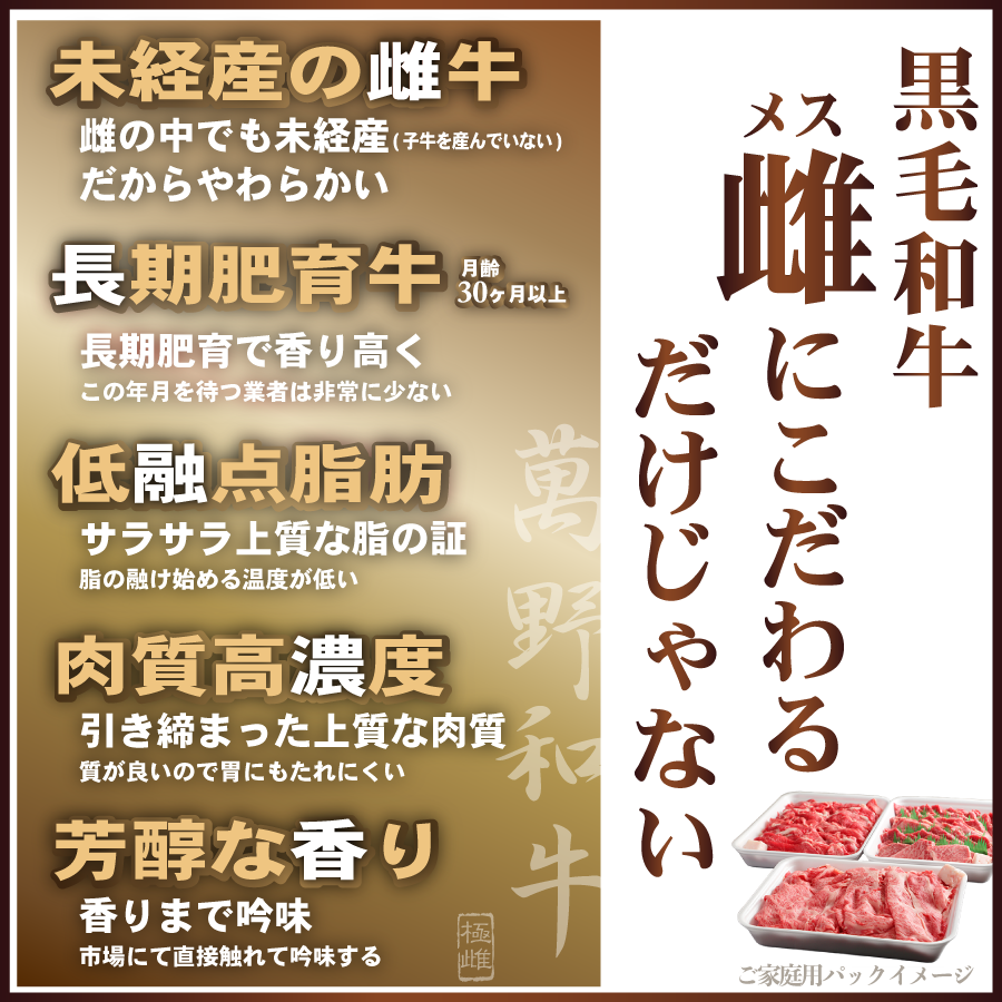 商品詳細 夢のような4種を、萬野屋の目利きで厳選焼肉の「本当の美味しさ」を知るあなたへ──萬野屋では「焼肉用」というひとくくりでは終わらせません。牛には80種類以上の部位があり、それぞれ異なる味わいと魅力があります。バラ、上カルピ、赤身、上赤身、特選赤身、ロースなどの中から厳選して4種類選びます。その日の入荷状況により、萬野屋のプロが、ベストな4種をお選びさせて頂きます。盛り合わせ例萬野屋の目利きでその時美味しいお肉を厳選しているので、部位のご指定はいただけません。仕入れ状況からベストな組み合わせでお届けいたします。バラ特徴:濃厚な旨味とジューシーな脂。適度な弾力があり噛むほどに旨味が感じられます。上カルピ脂の甘みと旨みが凝縮された人気部位。焼肉の王道。赤身肉しっかりとした肉の味わいが楽しめる部位。噛むほどに旨い。脂肪が少なく少し弾力がありながらも赤身であっさりとしている上赤身肉質がきめ細かく程よく霜降りが入っている特撰 赤身赤身の深いコクと上品な甘みがあるロース赤身と霜降りのバランスが良く、柔らかさと旨味を兼ね備えています。舌の上でとろけるような食感。ベスト4種上記などのお肉の中から、その日の仕入れ内容でベストな萬野和牛をチョイス。萬野和牛のしつこくないサラリの脂に慣れると、他で食べられなくなるという方も。迷ったなら、迷わずこの4種盛がお勧めです!贈りたいという方が多かったため、ギフト包装にも対応いたしました。ぜひおうち焼肉やご贈答にご利用下さいませ。萬野屋は、創業以来「肉の目利き」として磨き続けた確かな審美眼と技で、厳しい条件を満たした品質の良い黒毛和牛〈雌メス〉だけを厳選して提供しています。一頭買いによる希少部位の提供と、黒毛和牛〈雌メス〉へのこだわりが生み出す芳醇な味わいは、他にはない特別な食体験を叶えます。“肉のプロ”として、食卓に感動と物語を届けることを使命としています。極雌 萬野和牛創業一世紀近く食肉問屋を営んできた萬野家の経験から徹底的に鍛えられてきた選別眼。その目によって選び抜かれた優秀な素質を持つ黒毛和牛〈雌〉。それが、「極雌(ごくめん)萬野和牛」です。PREMIUM QUEEN’S BEEF未経産の雌牛雌の中でも未経産だからやわらかい長期肥育(月齢30ヶ月以上)長期飼育で香り高くこの年月を待つ業者は非常に少ないで低融点脂肪サラサラ上質な脂の証脂の溶け始める温度が低い肉質高濃度引き締まった上質な肉質質が良いので胃にもたれにくい芳醇な香り香りまで吟味市場にて直接触れて吟味する本当の意味での一頭買い何百頭の枝肉を生の状態で検品。脂質・肉質を直接手で触れ脂の融点や肉の香りを吟味。(無駄な中間業者を挟まない)安売りではなく安くする我々の目利き・知識で仕入れを行います。そのためにも全社員で捌く技術をも体得し、いくつも業者を通さないことでコストを削減し、上質のお肉をギリギリまで抑えた価格で、お客様へお届けしております。いのちと向き合うから日々「いのち」と向き合う萬野屋では、牛肉を隅から隅まで余すことなくご賞味頂くことで、無駄なく好循環をもたらしていきたいと考えております。どうぞ今後とも萬野屋をご利用下さいませ。 商品名萬野和牛 焼肉4種盛内容量焼肉カット 4種 計1kg(5-7人前)包装通常簡易包装 「ギフト包装」対応可能商品(箱詰+帯包装)+500円/1セット ※ギフト包装希望分は熨斗も可(備考欄へご希望内容をご入力下さい)※写真はすべてイメージです カートに入れる